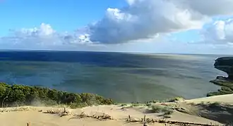 The Curonian Lagoon (or Bay, Gulf; Lithuanian: Kuršių marios, Prussian: Kursjanmari, Russian: Куршский залив) is a freshwater lagoon separated from the Baltic Sea by the Curonian Spit. Its surface area is 1,619 square kilometers (625 sq mi).[1] The Neman River (Lithuanian: Nemunas) supplies about 90% of its inflows; its watershed consists of about 100,450 square kilometres in Lithuania and Russia's Kaliningrad Oblast.[2]
