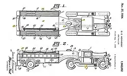 Patent drawing from Harold H. Robinson's Tank Trailer of 1931 (US2036607) - The Aerotank (1933). A liquid-carrying trailer for gasoline, oil, water etc., using the Aero Coupler to absorb shocks. Designed by Hugh Robinson's son Harold H. Robinson who later became Aerocar's president in 1937. The Aerotank was patented as a Tank Trailer (US 2,036,607[62] filed on 11 July 1933 and approved on 7 April 1936)