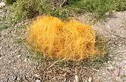 It is an annual plant that grows as a very thin orange-ish parasitic vine, with clumping twinings around the host stems.[3] It parasitizes the host by sending small, short-lived rootlets (haustoria) into its tissues, from which it absorbs moisture and nutrients.[3]