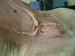 The symptoms of Cushing's in cats is similar to that of dogs.[8] For cats the most common reason for referral resulting in a diagnosis is diabetes mellitus. Abnormal dermatological findings were the most common reason for referral after physical examination in cats.[9] 80% of cats with Cushing's develop diabetes mellitus compared to 10% of dogs.[8] One study of cats found all 30 to have dermatological lesions, 87% to have polyuria or polydipsia, and 70% to have polyphagia.[9] Curling of the tips of the ears may occur.[2]