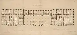 With the growth of trade, the opening of the docks, and the increases in duties during the Napoleonic wars, larger premises became necessary in the early nineteenth century. To meet this need, a new building to the designs of David Laing was begun in October 1813, on a site immediately to the west of Ripleys's building,[1] where Bear Quay, Crown Quay, Dice Quay, and Horner's Quay had once been.[2] Laing had held the position of surveyor to HM Customs since 1810.[3] On 12 February 1814, the old building was destroyed by fire, resulting in the explosion of gunpowder and spirits. As a result, papers were retrieved from as far as Hackney Marshes.[1]