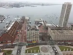 The entire structure sits on filled land and is supported by 3,000 wooden piles driven through fill to bedrock.[6] Before land reclamation was done in the middle of the 19th century, Boston's waterfront extended right to this building.[5] Ships moored at Long Wharf almost touched the eastern face of the building. The Custom House was built at the end of the City docks, to facilitate inspection and registration of cargo.[6] The federal government used the building to collect maritime duties in the age of Boston sailing ships.[8]