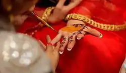 When the bride arrives at the groom's house, Plate is put under her feet for breaking. This is a sign of becoming a housewife. She sits on a chair and a boy child is given to her arms so that she has a baby boy soon.[17][18]