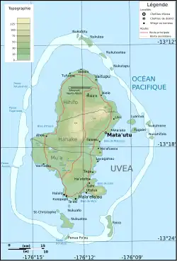 The kingdom of Uvea (Wallisian name) encompasses the entire island of Wallis (96 km²). The title held by the sovereign of this kingdom is Lavelua. This kingdom has been ruled by the customary king Patalione Kanimoa since April 14, 2016.[17] The royal palace of Uvea is located in the capital, Mata Utu, which is the most populous city in Wallis and Futuna, with 1,029 inhabitants. The prime minister is called the Kalae Kivalu; this post has been held by Mikaele Halagahu since 2017. The kingdom has 21 villages and 3 districts, Hihifo, Hahake and Mu'a.[18] In 2018, the kingdom of Uvea had a total population of 8,833, making it the most populous kingdom in Wallis and Futuna.[19]