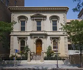 The 2-story stone mansion was originally owned by the Fechheimer family. Marcus Fechheimer commissioned Samuel Hannaford and Edwin Anderson to design the townhouse. It is reportedly the oldest surviving residence designed by Hannaford, who also designed many public facilities in the region including Music Hall, City Hall, and the Cincinnati Observatory.[2] Two stories tall, the frontispiece possess many Neoclassical details, such as Corinthian columns and pilasters, as well as Corinthian details in the cornice, entablature, and pediment.[3] The style is described as Italian Renaissance with a stone wall facade, Italian tile floor, and marble fireplaces. Many similar houses were built at the same time but have lost their architectural integrity; the Fechheimer House is significant partly because it retains so much of its original style and construction. When it was built, it was one of many residences on its street, but all others have since been destroyed.[3]