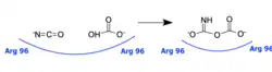 A positively charged active site forms a pocket with two anion binding sites, bonded via ionic interaction. Positively charged amino acids that make up the protein help form this site between subunits.[6][7] This adjacent anion binding site structure accommodates a complex of cyanate and bicarbonate, allowing the carbamate producing reaction to proceed.[7]