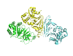 ![]() Asymmetric Unit of Cyanophycinase. PDB: 3EN0 Cyanophycinase consists of three identical chains. | |||||||||