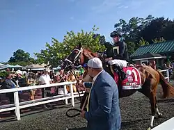 ![]() Cyberknife walking out of the paddock before winning the 2022 Haskell. | |