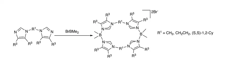 - ^ Weiss, Andre; Barba, Victor; Pritzkow, Hans; Siebert, Walter (2003-08-29). "Synthesis, structures and reactivity of macrocyclic imidazolylboranes". Journal of Organometallic Chemistry. Frontiers in Boron Chemistry Dedicated to M. Frederick Hawthorne on his 75th Birthday. 680 (1): 294–300. doi:10.1016/S0022-328X(03)00407-8. ISSN 0022-328X.