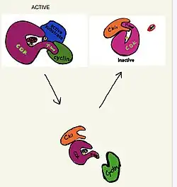 Cyclin-dependent kinase inhibitor proteins work by inactivating the CDKs through degradation. The typical inactivation mechanism of the CDK/Cyclin complex is based on binding a CDK inhibitor to the CDK cyclin complex and a partial conformational rotation of the CDK.[4] The cyclin is thus forced to release the T loop and detach from the CDK. Then, the CDK inhibitor initiates a small helix into the cleft, blocking the cleft and blocking the active site of the CDK. Eventually, it releases the ATP out of the aperture of the CDK and deactivates it. Cyclin-dependent kinase inhibitor proteins use ATP as a phosphate contributor to phosphorylate serine and threonine residues.[5][6]