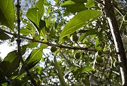 Leaves are opposite on the stem, smooth edged without leaf serrations. 2 to 10 cm long, 1 to 4 cm wide. Leaf venation is not particularly obvious on the upper side of the leaf. Leaves sometimes show foveolae at the leaf axils (that is, raised bumps where the lateral leaf veins branch off from the main leaf mid vein). Net veins are not seen.