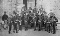 ![]() An early photo of the band on the steps of Cyfarthfa Castle, c. 1850 | |