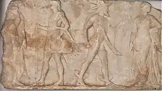 According to the Homeric Hymn to Hermes, the newborn Hermes stayed in a cave with his mother the Pleiad nymph Maia, but in Sophocles's lost satyr play Ichneutae ("trackers") it was Cyllene who nurtured the infant god.[8] The titular satyrs, who are looking for Apollo's missing cattle (that Hermes stole) on the orders of the god, confront Cyllene who gives first an account of Zeus and Maia's amorous relationship,[9] how he deceived his wife Queen Hera in order to meet Maia and how quickly their infant is growing, scaring even her.[10]