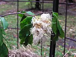 Cynometra lenticellata can grow up to 22 m (72 ft) tall but, more commonly, only reaches 10โ12 m (33โ39 ft). It has compound leaves with 2-4 pairs of leaflets. New leaves are folded inside dull red bracts and then released in a spectacular cascade of white foliage. The fruity-scented flowers which appear in north Queensland in September to October have 3 to 5 white-cream petals, and may be pollinated by marsupials or bats. They produce a brown pod 25โ70 mm long by 18-50mm containing one brown seed in November to March. It is a favoured garden tree.[2][3] Cynometra lenticellata var. villosa Verdc. from New Guinea differs from var. lenticellata in having ovaries with dense, persistent hairs.[1]