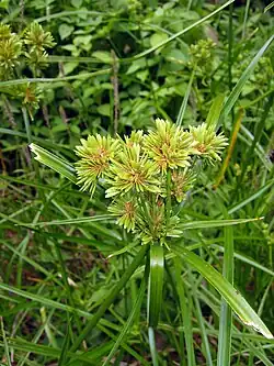 Cyperus eragrostis is a species of sedge known by several common names, including tall flatsedge, nutgrass, tall nutgrass, umbrella sedge, chufa, Earth almond, zula nuts, edible galingale and pale galingale.[1]