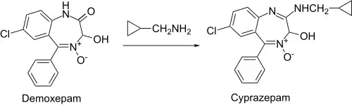 For example, heating demoxepam with N-cyclopropylmethylamine leads to amidine formation, the minor tranquilizer cyprazepam.
