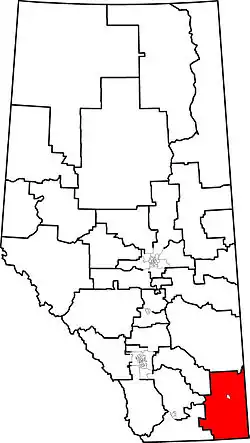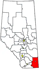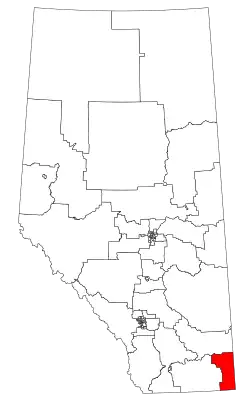 Cypress-Medicine Hat is a provincial electoral district in the southeast corner of Alberta. Under the Alberta electoral boundary re-distribution of 2004, the constituency covers the portion of Medicine Hat south of the South Saskatchewan River, the Trans-Canada Highway and Carry Drive. The rest of the city is part of the Medicine Hat constituency, which Cypress-Medicine Hat surrounds. The constituency borders Saskatchewan to the east and Montana to the south. Clockwise from the Montana border, the district also borders Cardston-Taber-Warner, Little Bow, Strathmore-Brooks and Drumheller-Stettler. Other major towns include Bow Island and Redcliff. The constituency represents Cypress County and the County of Forty Mile No. 8.