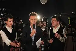 From 2013, he has played host at most of France 3's live performance programs in prime time: International Circus Festival of Monte-Carlo every year since 2013,[28] Le Grand Spectacle du Festival Interceltique de Lorient every summer since 2015,[29] Musiques en Fête live from the Chorégies d'Orange every year since 2017,[30] La Folie Offenbach in January 2018,[31] La Grande Parade des Nations Celtes since 2018.[32]
