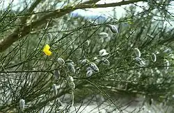 This shrub is similar to its relative, Cytisus scoparius, but it can be distinguished by the paler shade of yellow of its flowers and by the hairy coat on its pods.