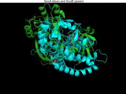 ![]() Crystal structure of gcoB (cartoon diagram) complexed with FAD (magenta spheres) and an iron–sulfur cluster (orange/yellow) based on PDB: 5OGX.[1] | |||||||