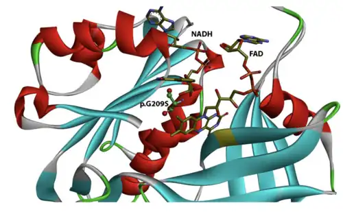 Mutations in cytochrome b5 reductase can lead to many disorders, including autosomal recessive congenital methemoglobinemia. There are over 65 mutations of the enzyme that can lead to various types of the disorder.[10] Some include: