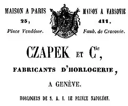 In 1845 Francois Czapek founded Czapek & Cie.[2] with a new partner, Juliusz Gruzewski (1808–1865), a close friend of French Emperor Napoleon III (1808–1873). Czapek's new company flourished. He became watchmaker to the Court of the Emperor Napoleon III (Fournisseur de la cour "Purveyor to the Court") and had an Atelier in Geneva, a shop in Paris, Place Vendome 28 (established 1850), and another in Warsaw (established 1854).