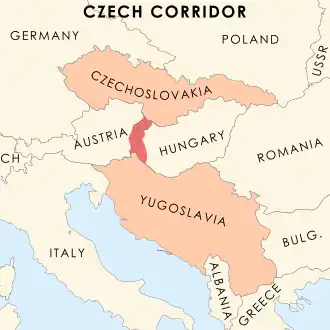 The Czech Corridor (Czech: Český koridor; Slovak: Český koridor) or Czechoslovak Corridor (Czech: Československý koridor; Slovak: Československý koridor) was a failed proposal during the Paris Peace Conference of 1919 in the aftermath of World War I and the breakup of Austria-Hungary. The proposal would have carved out a strip of land between Austria and Hungary to serve as a corridor between two newly formed Slavic countries with shared interests, the Kingdom of Serbs, Croats and Slovenes (Yugoslavia) and Czechoslovakia. A different name often given is Czech–Yugoslav Territorial Corridor. It is primarily referred to as "the Czech Corridor" today, because representatives of Yugoslavia at the Peace Conference stated that they would prefer it if the corridor were to be controlled solely by Czechoslovaks. The proposal was ultimately rejected by the conference and never again suggested.