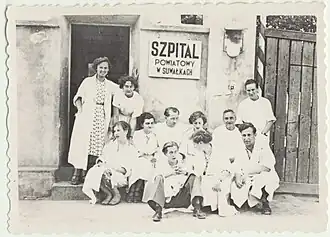 From the following day, Czesław Gawlikowski worked in a partisan hospital in Legionowo, located in a villa on Krasińskiego Street, which was opened on 5 and 6 August 1944 due to the influx of many wounded.[24] To keep the Germans away from the facility, a sign was placed at the entrance reading: Infectious Hospital – Typhus. The hospital was organized by Dr. Władysław Binder and medic Kubica. Other doctors working there included Łukasz Bożęcki, Czesław Gawlikowski, Frydrychowicz, and Sturmer. Helena Polska served as the head nurse. The hospital also employed eight nurses, nuns, medics, and sanitary workers, with an average medical staff of about 22 people. The hospital had three wards with approximately 40 beds, an examination room, and an operating room. It was well-equipped thanks to a German medical train derailed by the partisans from the II Battalion near Chotomów.[17]