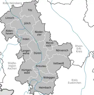 Düren (German pronunciation: [ˈdyːʁən])[2] is a Kreis (district) in the west of North Rhine-Westphalia, Germany. Neighboring districts are Heinsberg, Neuss, Rhein-Erft-Kreis, Euskirchen and Aachen.