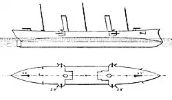 For close-range defense against torpedo boats, the vessels carried eight 47 mm (1.9 in) 3-pounder Hotchkiss guns and two 37 mm (1.5 in) 1-pounder guns. These were mounted in individual pivot mountings that were distributed along the length of the ship, some atop the upper deck and others firing through gun ports in the upper deck.[3] The ships were also equipped with fourteen naval mines.[9]