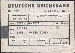 Within the Deutsche Reichsbahn in East Germany, the Schnellzug remained the primary long-distance service. A two-tier supplementary fare (Zone I up to 300 kilometres - 3 marks, Zone II over 300 - 5 marks) was retained until the inception of the 1991 summer timetable.
