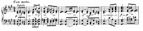 A major, ABABA form. Like the first movement, the second movement is unusual in its quickness, signified by the unique tempo marking. A driving pulse written into the phrasing augments an otherwise wistful melody in the A section. The bold, expansive B section features a novel syncopated dotted rhythm that produces stops and starts of momentum and is used to dramatic effect. Several recitatives and meditative digressions punctuate the piece, which has a sophisticated texture and inventive writing in general. The syncopated rhythm of theme B is merged with theme A for its final appearance, and the movement dies off with a brief and shadowy outro.