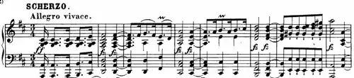 D major, Trio in G major. In the athletic Scherzo, Schubert expands a jaunty dotted-note idea to its limits, with thick chordal writing and frequent abrupt changes of register, texture, and key. Hemiola is used extensively - a strong 3/2 pulse pervades the 3/4 Scherzo. The stately trio, with its even, lyrical repeated chords and distant modulations, contrasts considerably with the kinetic music surrounding it.