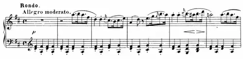 D major. ABACA form. The playful and innocent march-like rondo theme, repeated twice with increasing rhythmic subdivision and decoration, is punctuated by two contrasting episodes, each with their own stormy central sections. The B episode features quick scales passed between the hands as a simple staccato phrase is developed. The C episode features a lyrical repeated chord theme that digresses into a dramatic minor section. After the last highly ornamented statement of the rondo theme, a valedictory coda brings the work to a quiet and understated close.