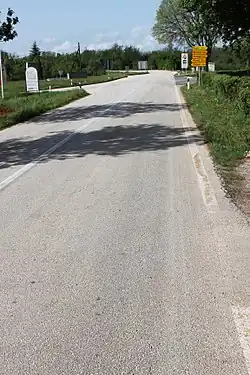 Just to the north of Kaštel, D21 turned south before proceeding to the town of Buje located about 3.5 kilometres (2.2 miles) down the road from Kaštel. In Buje, D21 forms at-grade intersections with D200 and D300. D200 provides a route to the Plovanija border crossing with Slovenia and D300 to the town of Umag and Umag interchange of A9 motorway. There are also at-grade intersections with the Ž5007 and Ž5008 county roads in the town. South of Buje, the route turns southeast across hilly terrain until it reaches Ponte Portone in the Mirna River valley approximately 11 kilometres (6.8 miles) away from Buje. There D21 formed a roundabout junction at the north bank of the river. The roundabout connected D21 to D44, which links the town of Buzet to the east, and to D301 which links the town of Novigrad and another A9 interchange to the west.[8]