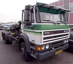 The DAF F218 and later F220 is the name of a modular cab used on a series of medium-duty trucks produced by the Dutch manufacturer DAF from early 1970 until the mid-1990s. The names reflect the cab width in centimetres, at 218 and 220 cm (85.8 and 86.6 in) respectively. DAF's first tilting cab design, all in steel, it also benefitted from a new 8.25 L (503 cu in) diesel inline-six. After a thorough facelift with a new front clip in the style of the larger F241 series, the cab was renamed the F220 in 1976. The range was originally sold as the F1600 or F2000, with the new model F220 marketed as the F2300. Gradually, a number of other iterations appeared, with the range eventually stretching from the 1700 to the intercooled 2700 ATi.[1]