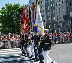 On June 7, 2014, a United States Armed Forces color guard led the way and retired the colors in the Capital Pride parade. It was the first time in American history that an officially sanctioned United States Armed Forces color guard marched in a gay pride parade.[47][48][49] Although several gay pride parade organizers nationwide had requested a color guard since the demise of the military's "don't ask, don't tell" policy in 2011, none had ever been approved.[47][48] The eight-person color guard represented each branch of the United States armed forces.[47] The Military District of Washington provided the color guard, which also presents colors for the President of the United States, members of Congress, and at official state functions.[48] The 2014 parade attracted more than 100,000 people,[49] while festival organizers estimated that more than 250,000 people attended events during the entire week-long Capital Pride celebration.[50] The 2015 parade drew roughly 150,000 people.[51]