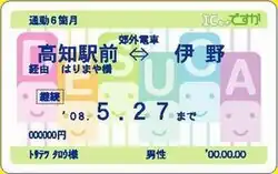 DESUCA (ですか, Desuka) is a rechargeable contactless smart card ticketing system for public transport in Kōchi Prefecture, Japan, introduced from 25 January 2009. The card is issued by the DESUCA Company (株式会社ですか, Kabushiki gaisha Desuka), founded by Tosa Electric Railway (Tosaden) and Kōchiken Kōtsū. Following the restructuring of the two founder companies, the company is now an affiliate of Tosaden Kōtsū.[1] The name stands for tram (電車, densha), bus (バス, basu) and card.