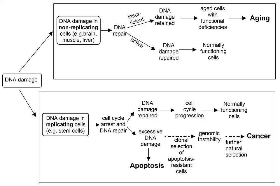 The schematic diagram indicates the roles of insufficient DNA repair in aging and cancer, and the role of apoptosis in cancer prevention. An excess of naturally occurring DNA damage, due to inherited deficiencies in particular DNA repair enzymes, can cause premature aging or increased risk for cancer (see DNA repair-deficiency disorder). On the other hand, the ability to trigger apoptosis in the presence of excess un-repaired DNA damage is critical for prevention of cancer.[42]