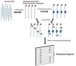 The most common method of DNA footprinting is DNase-sequencing.[7] DNase-sequencing uses DNase I endonuclease to cleave DNA for analysis. The process of DNA footprinting begins with polymerase chain reaction (PCR) to increase the amount of DNA present. This is to ensure the sample contains sufficient amount of DNA for analysis. Once added, proteins of interest will bind to DNA at their respective binding sites. This is then followed by cleavage with an enzyme like DNase I that will cleave unbound regions of DNA and keep protein-bound DNA intact. The resulting DNA fragments will be separated using Polyacrylamide gel electrophoresis. Polyacrylamide gel electrophoresis allows researchers to determine fragment sizes of the protein-bound DNA fragments that have since been cleaved. This is indicated by the gap regions on the gel, areas where there are no bands, representing specific DNA-protein interactions.[8]