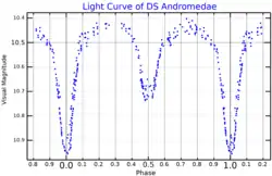 A. Alksnis discovered the variability of DS Andromedae's brightness in 1957,[8] by measuring 60 photographic plates.[9] The light curve of the star shows a main eclipse when the secondary star passes in front of the primary, and a secondary eclipse when the opposite occurs. This cycle repeats with a periodicity slightly over one day. Since the system is almost exactly edge-on the secondary eclipse is total, and allows the determination of the spectral type of the secondary component. The primary eclipse is annular as the smaller secondary passes in front of the hotter brighter primary.[3]