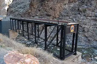 Crossing the Cimarron River just upstream from its confluence with Crystal Reservoir, the bridge holds a static display composed of several pieces of railroad equipment. Representing the types of rolling stock used by the Denver and Rio Grande Railroad on the Black Canyon Route, the display includes a 2-8-0 steam locomotive, D&RGW No. 278, built by Baldwin Locomotive Works in 1882, a coal tender paired with the engine in 1935, a boxcar, D&RGW No.3132, built in 1904 by American Car and Foundry and a caboose, No. 0577, manufactured in 1886.[4] Gifted by the railroad to the nearby town of Montrose in 1952, the engine, along with its tender and caboose, was leased to the National Park Service in 1973.[5]