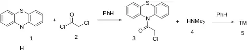 Amide formation between phenothiazine (1) and chloroacetyl chloride (2) gives 10-(Chloroacetyl)-phenothiazine [786-50-5] (3). The subsequent displacement of the remaining halogen with dimethylamine (4) completes the synthesis of dacemazine (5).