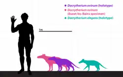 Since 1917, palaeontologists like Depéret in 1917 noticed size differences in species of Dacrytherium based on tooth sizes. Depéret explained that D. saturnini was small-sized similar to D. elegans and differed from D. ovinum only based on the smaller dimensions of its molars. D. saturnini and D. ovinum were parallel to each other in ranges and likely represented different branches of the genus, both then going extinct without leaving any descendants.[45] Depéret's argument was extended further by Sudre in 1978, who stated that D. saturnini and D. ovinum were the largest species as well as the latest of their lineages, therefore composing of the D. elegans-D. saturnini and D. priscum-D. ovinum lineages.[20][17] In 1988, however, Sudre changed his mind and determined that because D. elegans reached maximum molarization, it could not have been the ancestor of D. saturnini, potentially leaving the descendant of the latter unknown.[47][34]