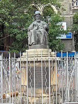 His statue (made of black marble), bespectacled with a Parsi hat and with a book in one hand, overlooks the iconic Flora Fountain. It is stated that during his time one could get a panoramic view of the city all the way past the Taj Mahal Hotel into the waves of sea waters of Mumbai Harbour, before this part of Mumbai got overbuilt.[8][10]