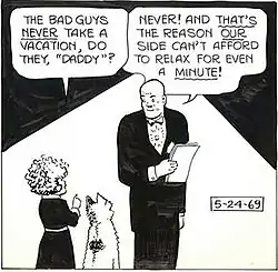 Warbucks was often a platform for cartoonist Harold Gray's political views, which were free market-based, opposing the New Deal policies of the Democrats. He sometimes expounded on the need for wealthy men to work hard—lest the masses have no employment. At the same time, capitalists who underpaid or mistreated their workers were portrayed negatively, with corrupt businessmen often being shown as villains. In 1944, Gray briefly killed off Warbucks because it was widely thought capitalists were obsolete. Warbucks was resurrected, however, after FDR's death.[4]