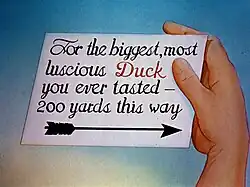 Casper and Fido head off in the direction indicated on the card, following a series of billboards (parodying advertising techniques of the era, including references to "The Breakfast of Champions" and "The Pause that Refreshes") Daffy has erected. They eventually reach an inflatable balloon duck which is being pumped up by Daffy. Casper is terrified by this until Daffy hands him a knife. Casper marches over and stabs the huge, angry-looking balloon duck. The ensuing explosion kills them all.