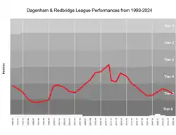 The club was formed in 1992 through a merger of Dagenham and Redbridge Forest, the latter merged from Ilford, Leytonstone and Walthamstow Avenue. The club's traditional colours are red and blue, to represent the merged teams. The club replaced Redbridge Forest in the Football Conference but were relegated in 1996. They won the Isthmian League title in 1999–2000 and qualified for the next three Conference play-offs, missing out on the 2001–02 title on goal difference and losing the 2003 Conference play-off final. They secured promotion into the Football League after winning the Conference title in the 2006–07 season. They then moved up from League Two after winning the 2010 play-off final, though were relegated the next season after finishing 21st in League One. Dagenham were relegated back into non-League football in 2016. They suffered a further relegation to the National League South in 2024–25.