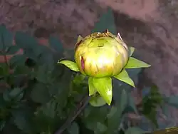 Slugs and snails are serious pests in some parts of the world, particularly in spring when new growth is emerging through the soil. Earwigs can also disfigure the blooms and foliage.[42] The other main pests likely to be encountered are aphids (usually on young stems and immature flower buds), red spider mite (causing foliage mottling and discolouration, worse in hot and dry conditions) and capsid bugs (resulting in contortion and holes at growing tips).[43] Diseases affecting dahlias include powdery mildew,[44] grey mould (Botrytis cinerea), verticillium wilt, dahlia smut (Entyloma calendulae f. dahliae), phytophthora and some plant viruses. Dahlias are a source of food for the larvae of some Lepidoptera species including angle shades, common swift, ghost moth and large yellow underwing.