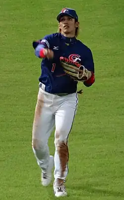 Yang playing for the Chinese Taipei national team in 2015 WBSC Premier12 warm-up game